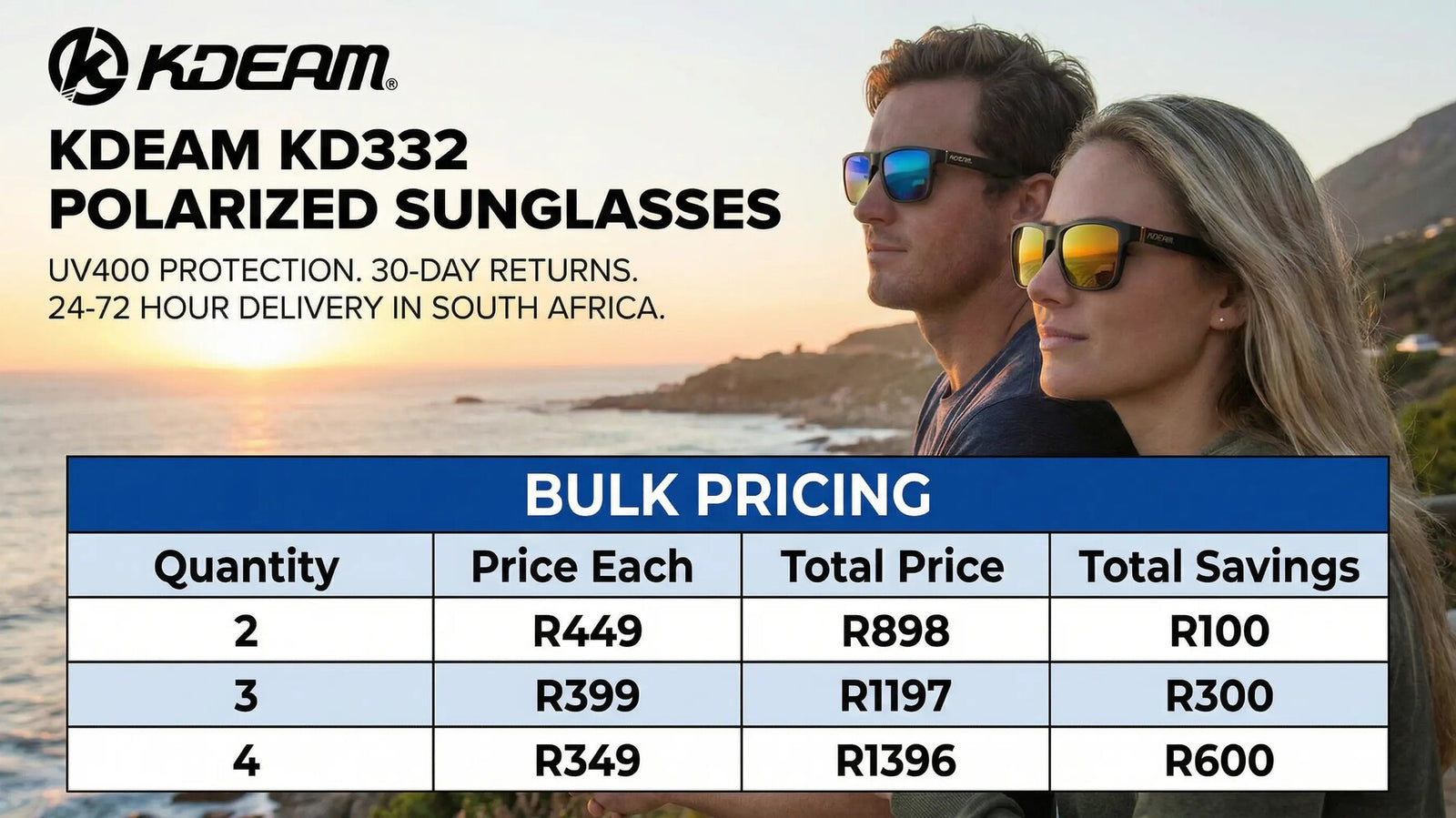 Grab our exclusive Kdeam South Africa offer! Choose any 2 pairs for just R898 (save R100), 3 pairs for R1197 (save R300), or 4 pairs for R1396 (save R600)!